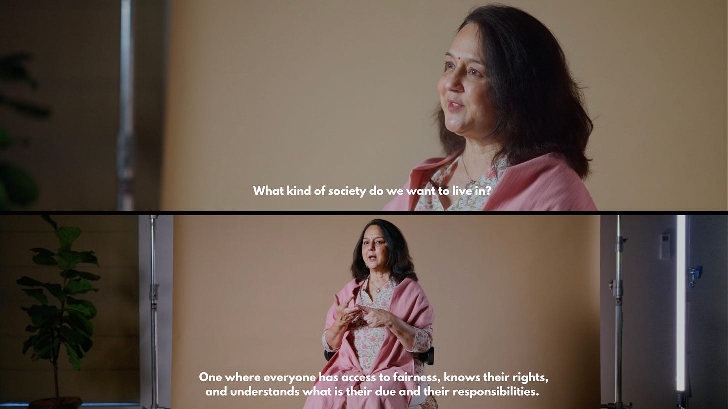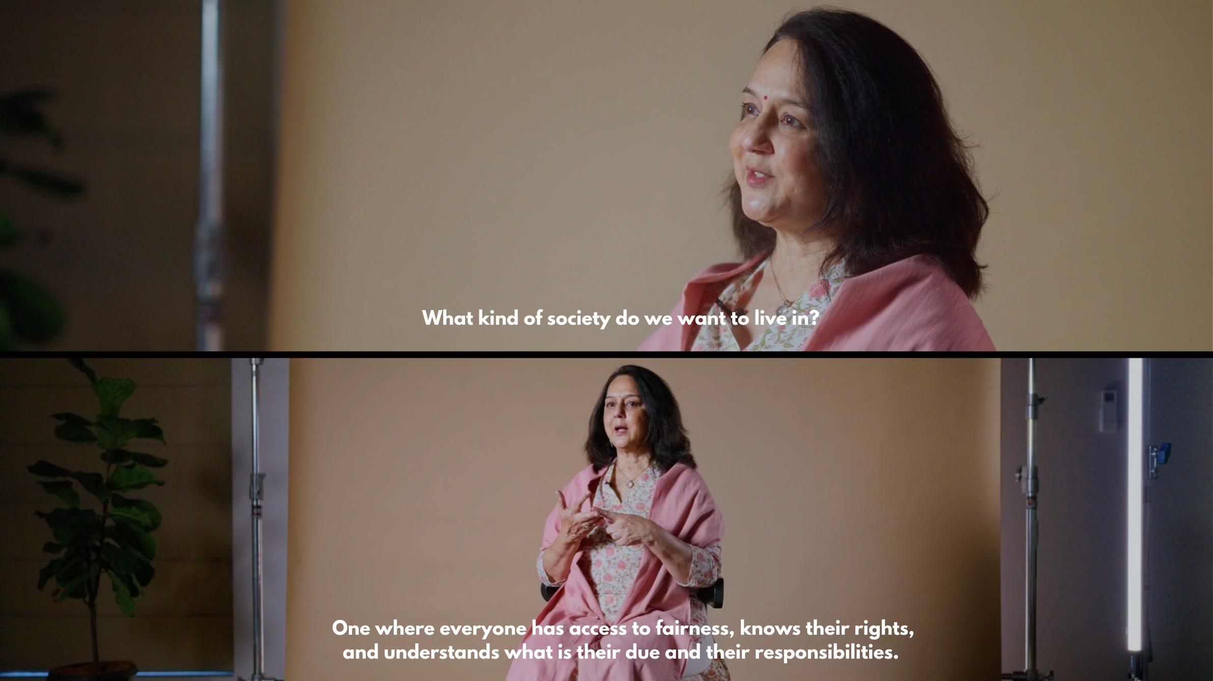 A reframing. To reframe justice as a space that’s alive, messy, participatory and full of potential. I remember being behind the camera as Rohini Nilekani, Chairperson of Rohini Nilekani Philanthropies, summed up the reframing as simple, humane issues.